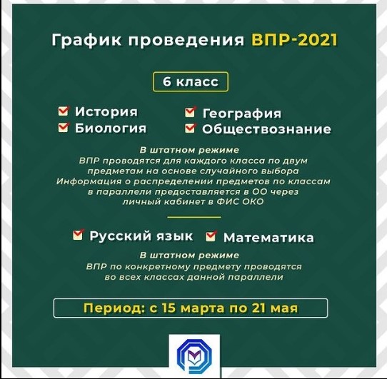 График проведения Всероссийских проверочных работ в 6 классах в 2021 году.