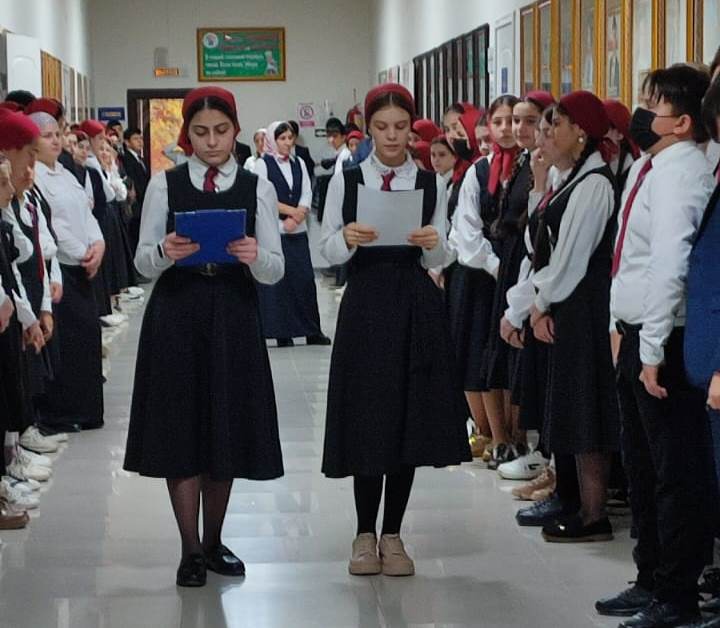 Общешкольная линейка открытия недели чеченского языка и литературы. Выступление ведущих.