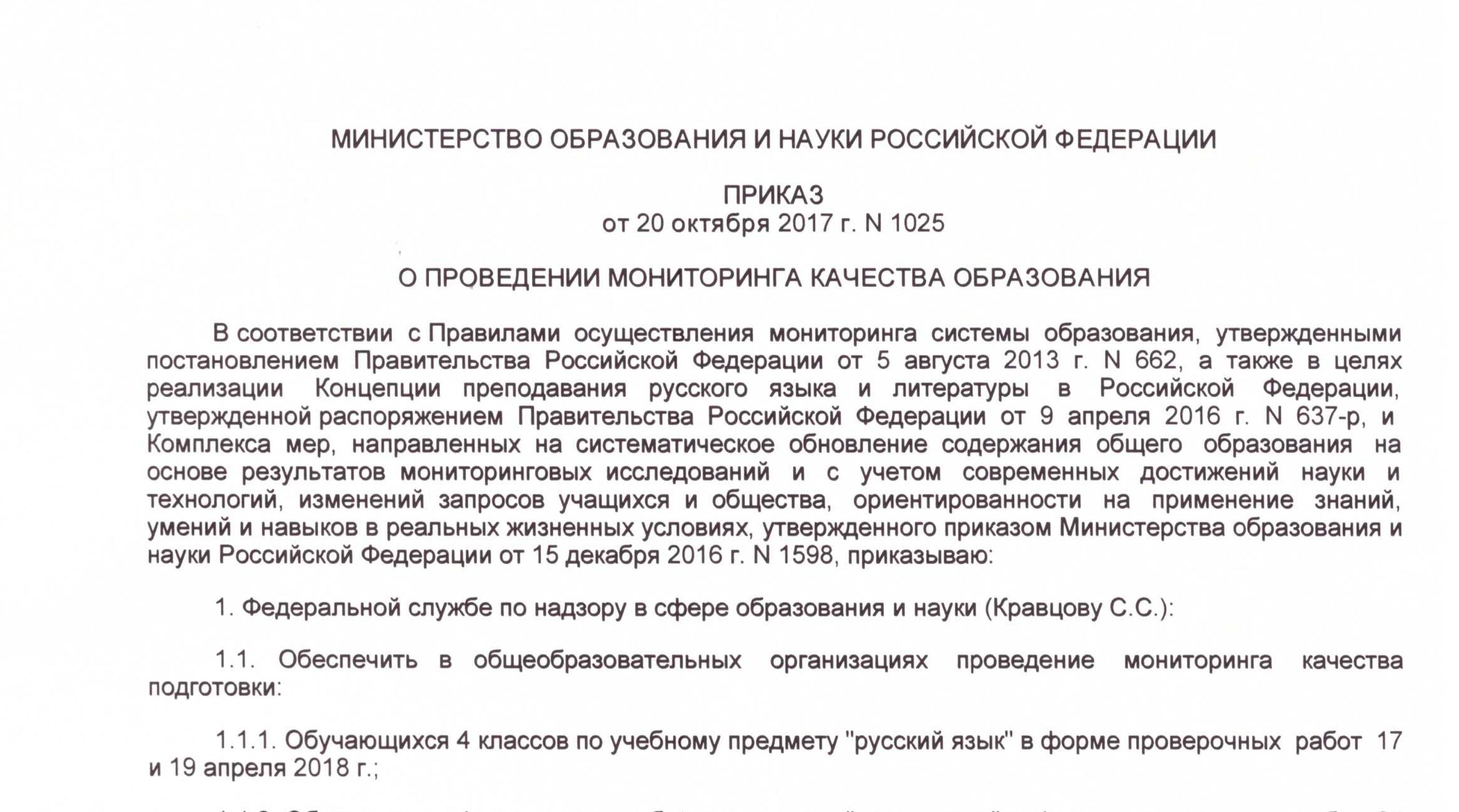 08.11.2017В соответствии с Правилами осуществления мониторинга системы образования, утвержденными постановлением Правительства Российской Федерации от 5 августа 2013 г. N 662, а также в целях реализации Концепции преподавания русского языка и литературы в Российской Федерации, утвержденной распоряжением Правительства Российской Федерации от 9 апреля 2016 г. N 637-р, и Комплекса мер, направленных на систематическое обновление содержания общего образования на основе результатов мониторинговых исследований и с учетом современных достижений науки и технологий, изменений запросов учащихся и общества, ориентированности на применение знаний, умений и навыков в реальных жизненных условиях, утвержденного приказом Министерства образования и науки Российской Федерации от 15 декабря 2016 г. N 1598, приказываю: Федеральной службе по надзору в сфере образования и науки (Кравцову С.С.):