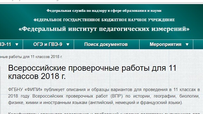 27.12.2017Федеральный институт педагогических измерений (ФИПИ) опубликовал описания и образцы вариантов Всероссийских проверочных работ (ВПР) 2018 года для учащихся 11 классов.