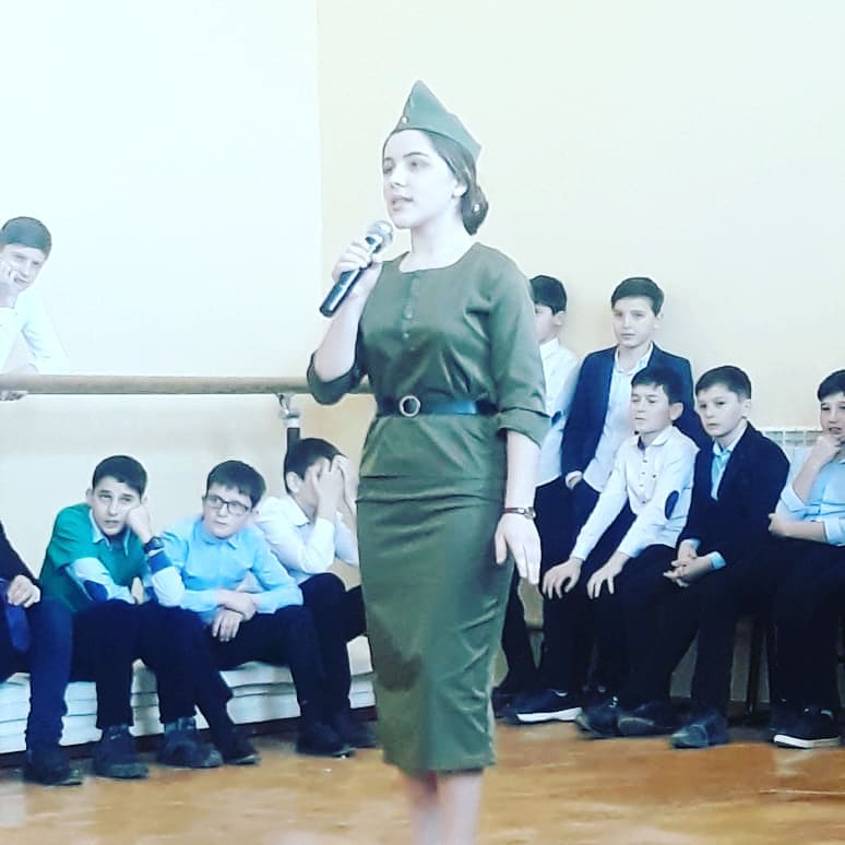В музыкальных паузах праздничной программы «А ну-ка, парни!» выступила с сольным номером Аюбова Танзила, ученица 9 класса. В её исполнении прозвучала песня о ветеранах войны «Седые головы».